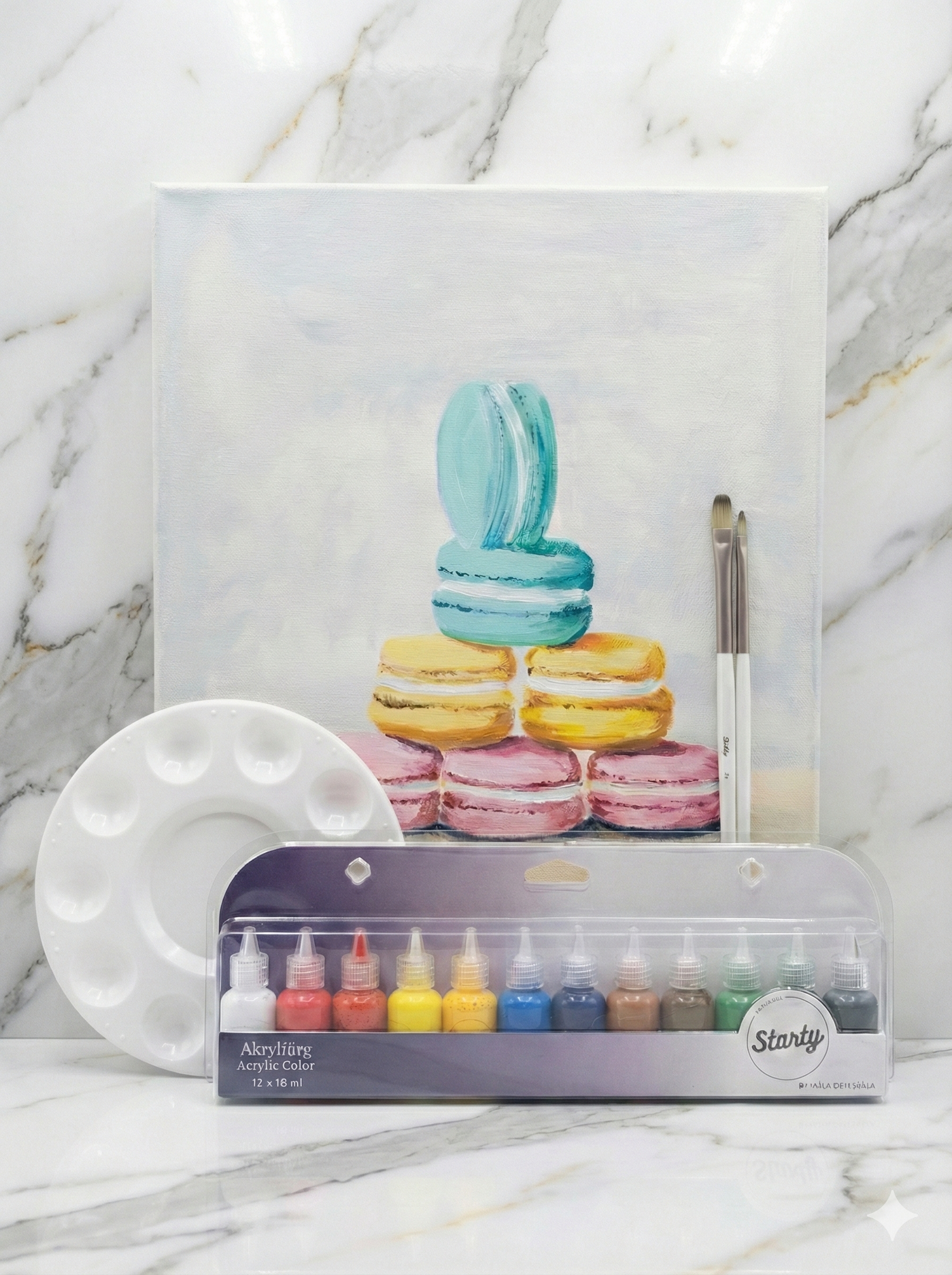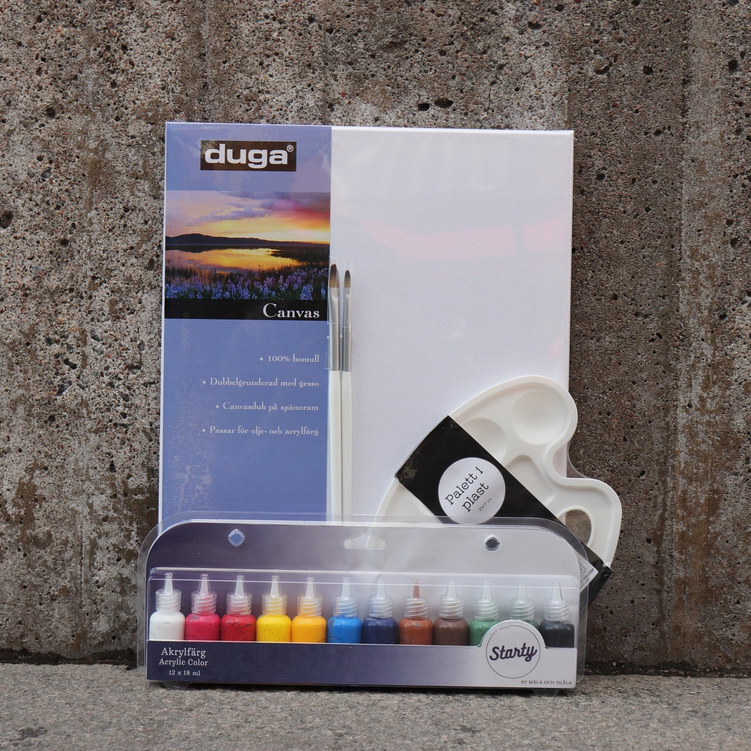 Perfekt för dig som vill börja måla direkt! Kitet innehåller två flata syntetpenslar (storlek 1 och 2), en målarduk, färgset med 12 x 18 ml, samt en praktisk palett. Ett komplett målarkit – bara öppna och börja skapa!